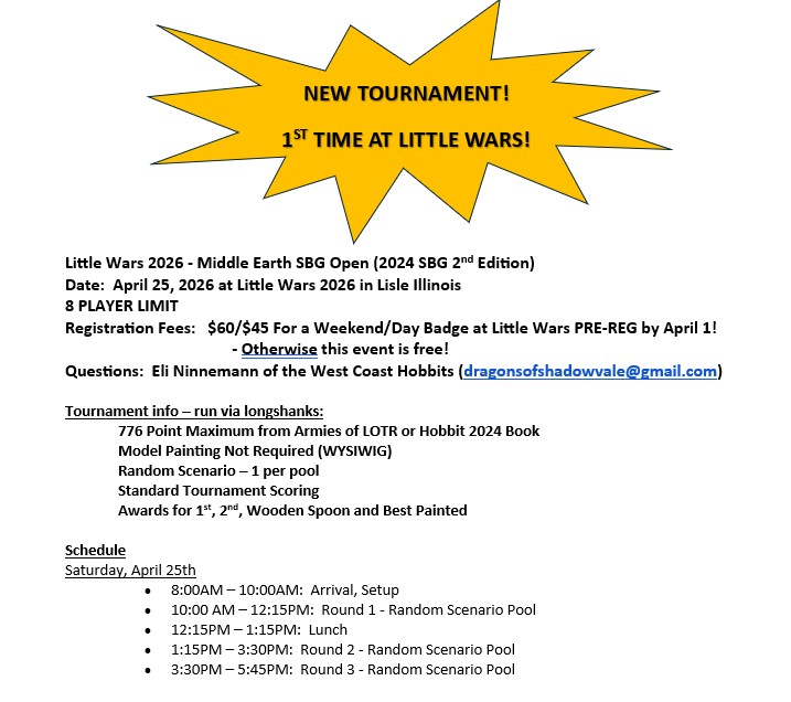 For more detailed info and to PRE-REGISTER for this tournament, visit: https://mesbg.longshanks.org/event/31821/